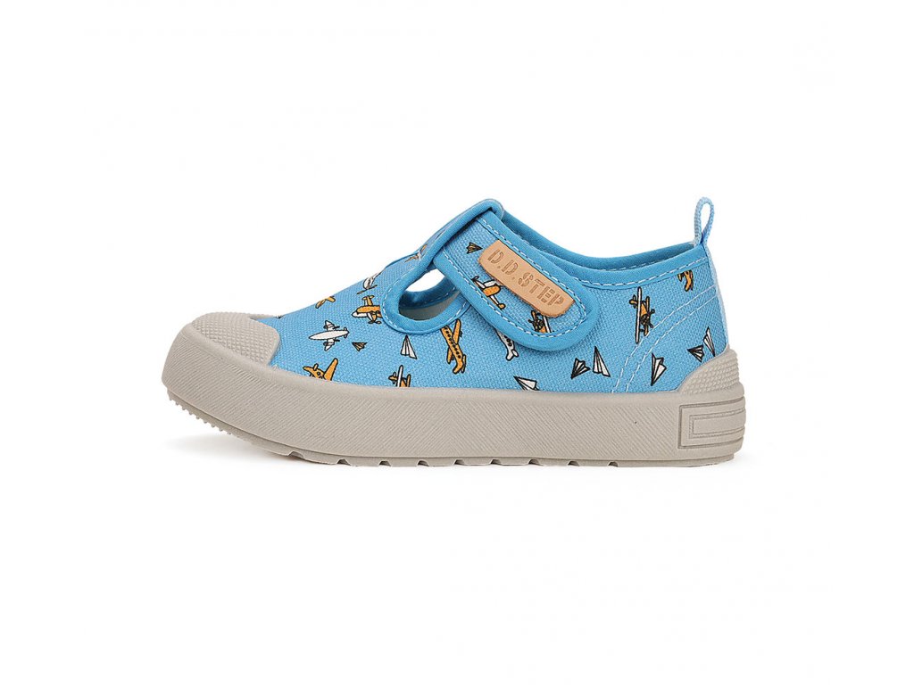 Dětské plátěné tenisky D.D.step. Mají velmi nízkou hmotnost a měkkou, ohebnou a neklouzavou podešev. Měkký a nízký opatek, vyjímatelná stélka s mírnou podporou klenby. Zapínání na jeden suchý zip pro snadné dotažení v nártu.